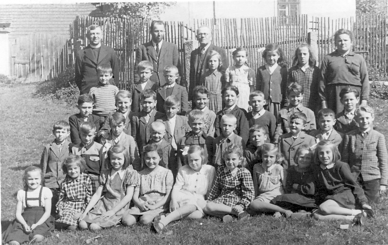 Žáci tochovické školy s p. farářem Smrčinou, p. učitelem Vondráškem a p. řídícím učitelem Hejnou